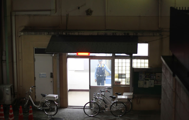 ressemble au décor d'un film de Kiyoshi Kurosawa, avec derrière la vitre un policier immobile comme
