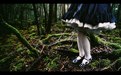 Dans Psychopomp, l’un de leurs plus beaux clips, elles sont mises en scène par le photographe Dan Szpara à Aokigahara, la fameuse forêt des suicidés. On croit d’abord à des images fixes, déjà fascinantes, avec ces lichens verdâtres et mordorés couvrant les troncs d’arbres, mais si on y prête attention, il y a toujours un frémissement dans l’image : une touche de lumière vibrante, des feuilles d’herbes, des insectes… Les Necronomidol apparaissent une à une, elles-aussi immobiles, comme intégrées à cette vie séculaires. Elles ne chantent pas et ne sont jamais réunies. Chacune est découpée en plans de mains, de jambes, de cheveux, comme si elles entraient dans un monde dont le visage n’était plus le centre et dont le temps humain n’était pas non plus la mesure. Si la forêt les entoure, elles sont comprises entre deux motifs : un crâne de cerf blanchi et ce tapis de feuilles d’automne gorgé d’humidité. Les jeunes filles magiques mènent ainsi cette vie parallèle, entre l’os ayant atteint son point inaltérable et les matières organiques en décomposition.